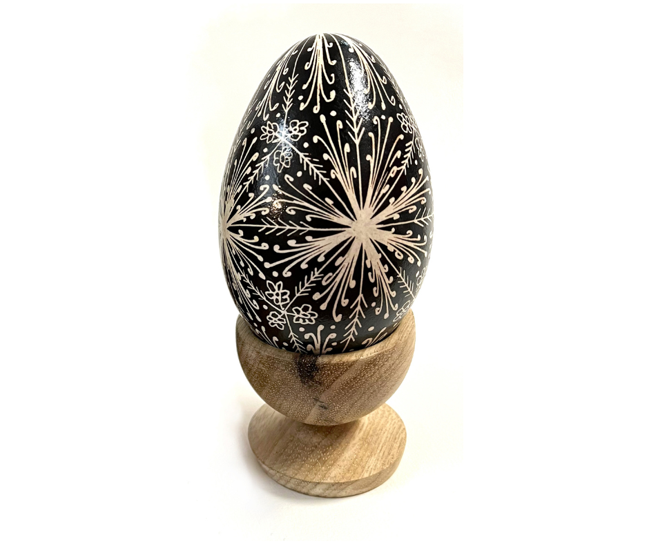 Ukrainian pysanka egg- “Valentina,” by Andrea Kulish Wilhelm, plus handmade pottery egg stand by Lori Theriault (egg stand not pictured)