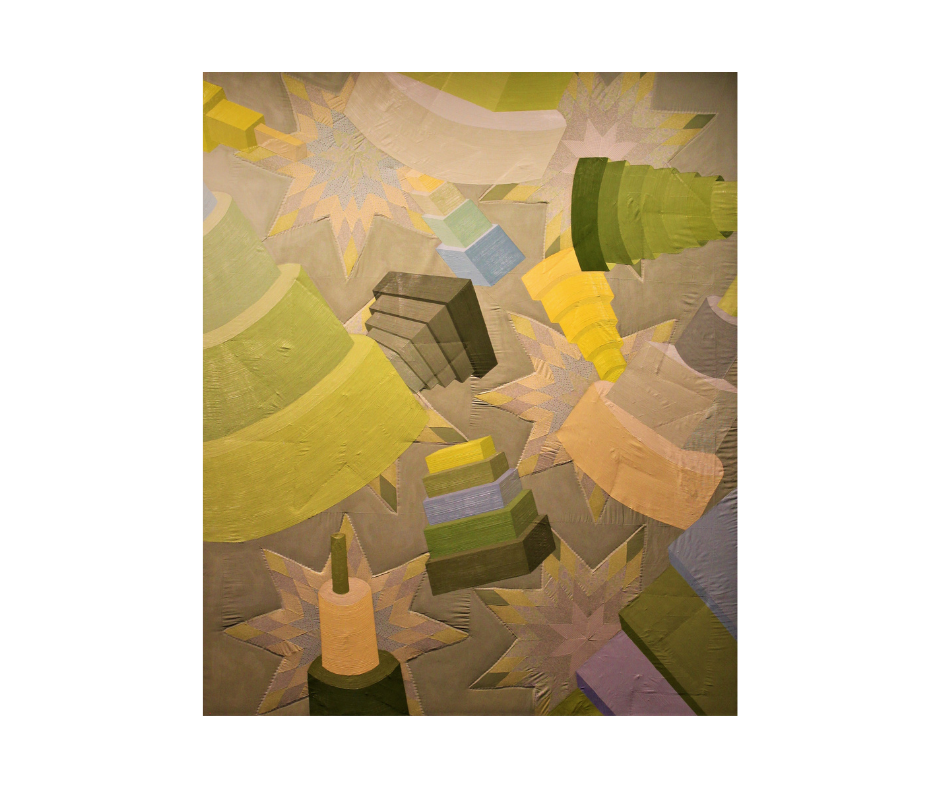 Art piece: “Exploding Babel” is an oil on quilt painting 72″ x 60,” by Jeremy Phillips