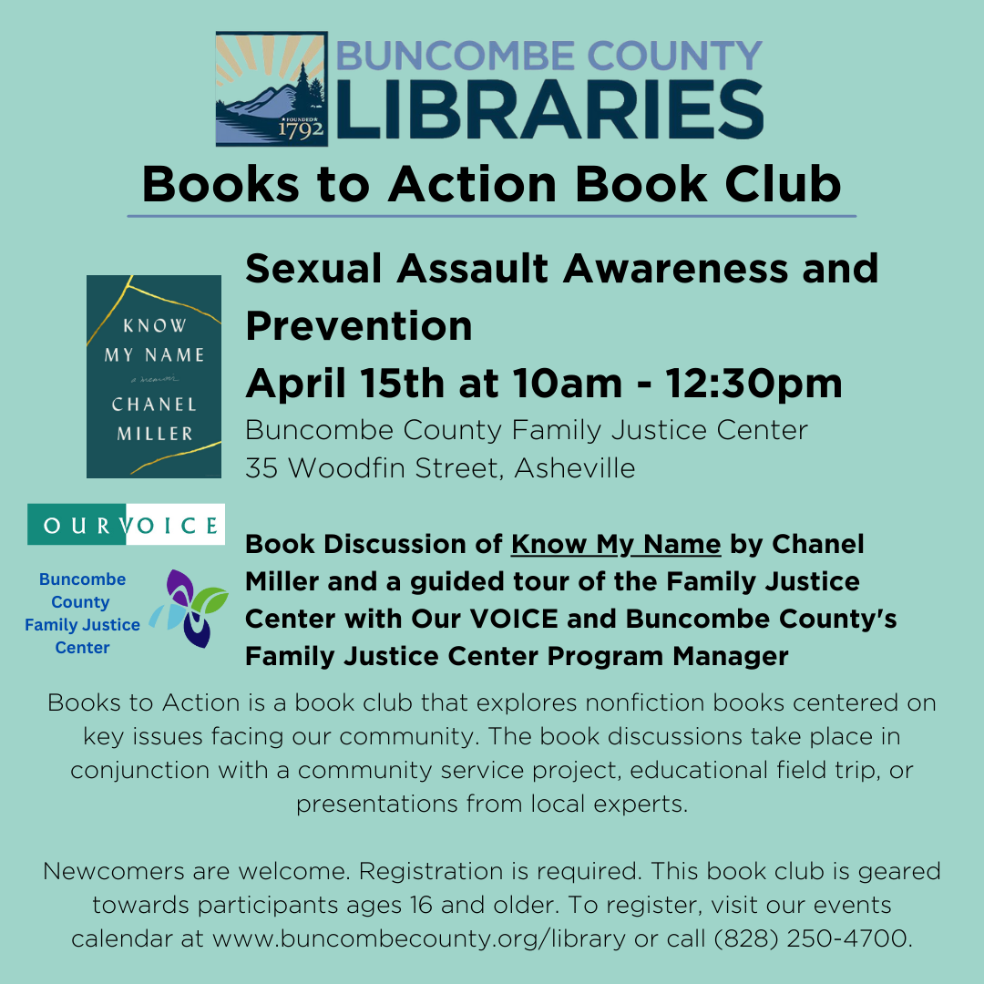 Books to Action is a book club that explores nonfiction books centered on key issues facing our community. The book discussions take place in conjunction with a community service project, educational field trip, or presentations from local experts. Newcomers are welcome. Registration is required. This book club is geared towards participants ages 16 and older. To register, visit our events calendar at www.buncombecounty.org/library or call (828) 250-4700.